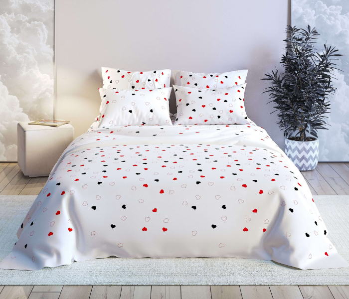 Этот комплект постельного белья создан для тех, кто ценит романтику и нежность. Белоснежное полотно украшено разбросанными по поверхности сердцами в красных и черных тонах, придавая уюту вашей спальни нотку игривости и элегантности. Изготовленный из высококачественной бязи, он обеспечивает комфортный и здоровый сон благодаря своей мягкости и воздухопроницаемости.